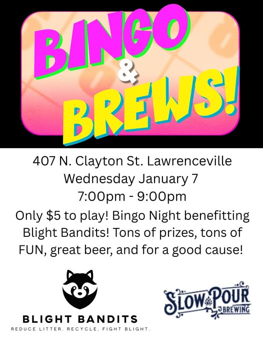Weds Jan 7: Mom’s night out idea! Play BINGO and support Blight Bandits! Free, Easy parking at Slow Pour Brewing Company