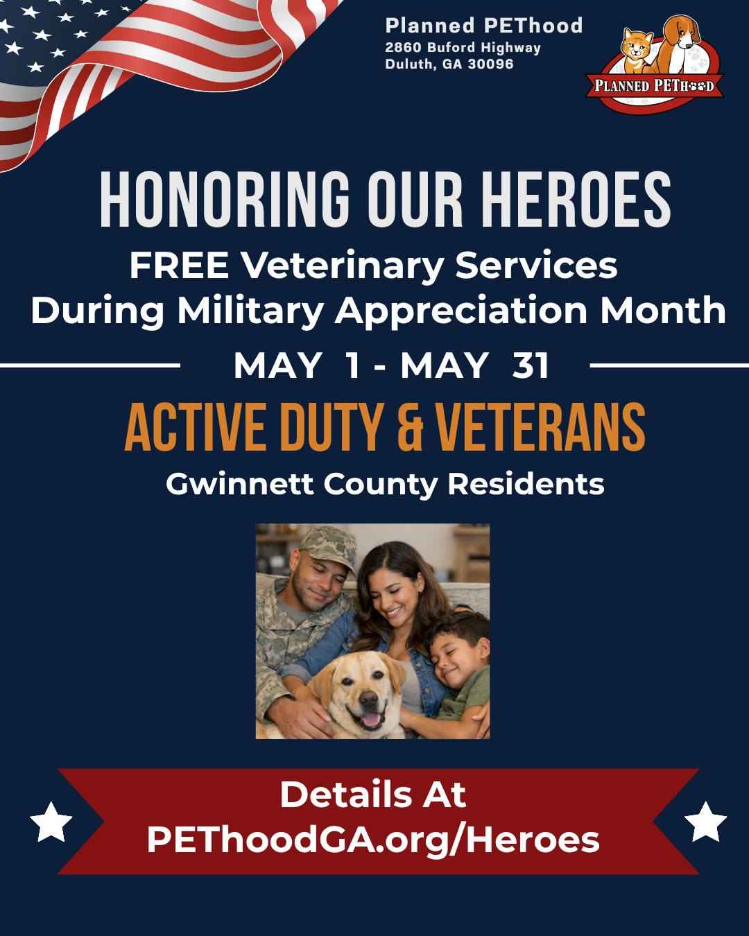 Thanks to the generous support of the Sunstate Foundation, Planned PEThood is offering FREE veterinary care for pets of active-duty and retired military families in Gwinnett County.