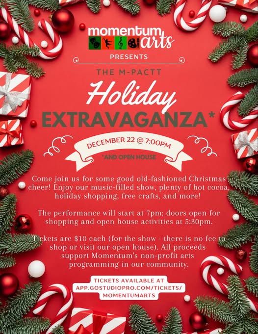“Momentum Arts presents The M-PACTT Holiday Extravaganza on December 22 at 7:00pm, plus an open house you won’t want to miss.
