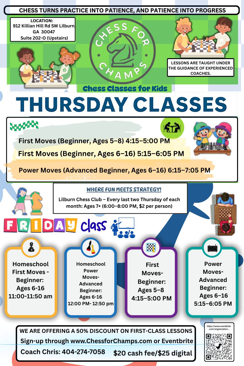 First-time students receive 50% off their first class. It’s a great way to come try a class and see what Chess for Champs is all about.