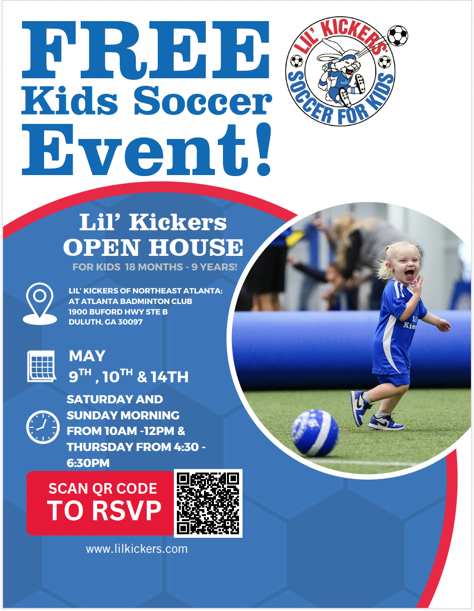 Join our FREE Kids Soccer Open House on May 9 & 10 (10:00 AM–12:00 PM) and May 14 (4:30–6:30 PM) at Atlanta Badminton Club, Duluth