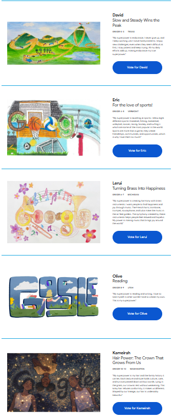 (Vote by Wednesday- Just for fun): Google’s 17th annual Doodle for Google contest is wrapping up, and five talented K-12 students from across the country have been selected as finalists. This year’s theme: “My superpower is…”